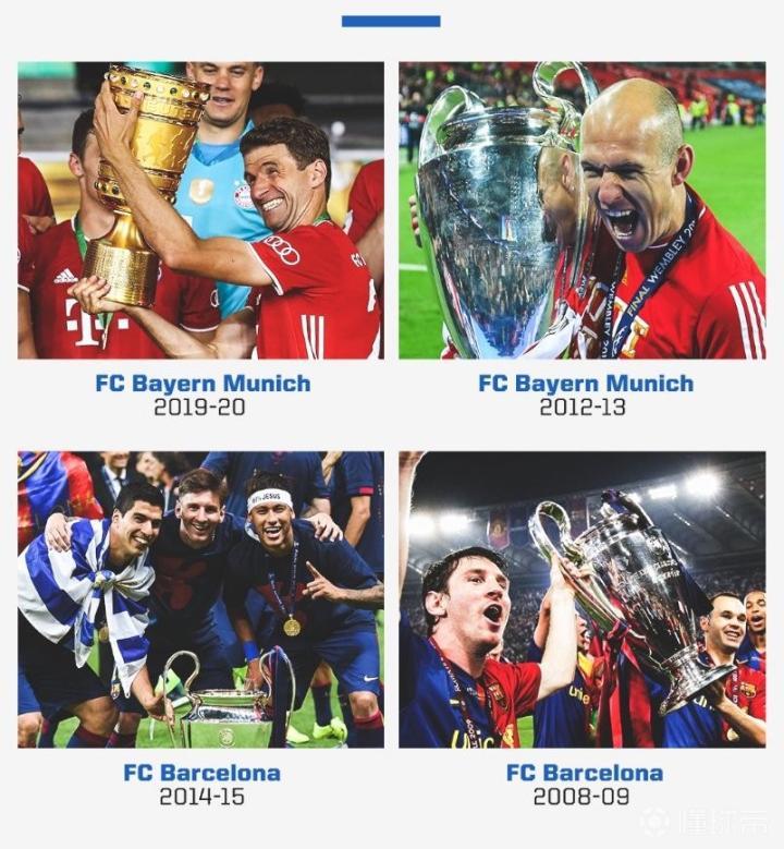 此外,拜仁也成为欧洲足坛第二支两次收获三冠王的球队,第一支是巴塞罗那,巴萨曾于2008/09赛季和2014/15先后两次加冕三冠王。