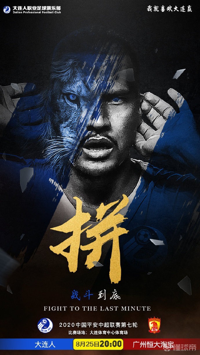 北京时间8月25日晚20:00,中超第一阶段第7轮,大连人将对阵广州恒大淘宝。赛前,大连人足球俱乐部官方发布预热海报,主题为:拼!