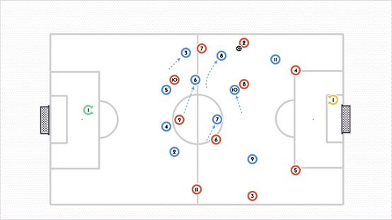 进攻型中场的防守任务主要以支持中场,在中路制造人数优势为主。这同样也能保持阵型紧凑,以及提供掩护和支持前锋。他还应该时刻关注对方控球中场回撤接球。