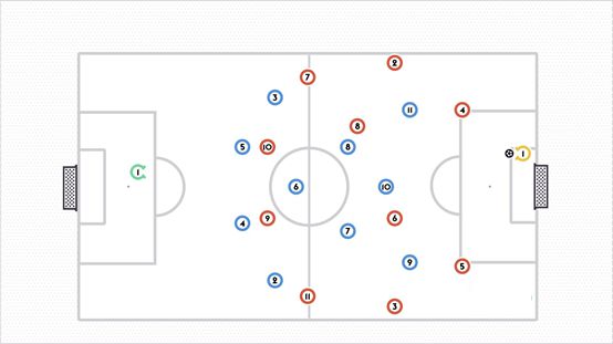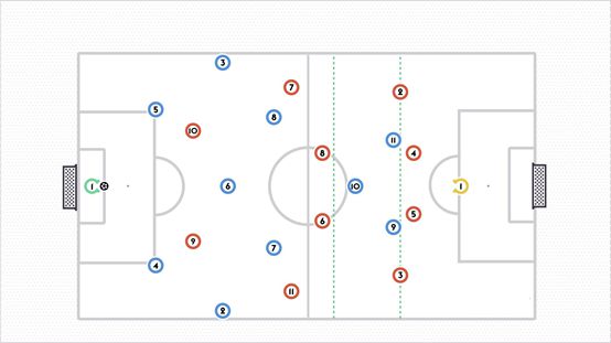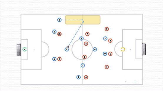 当守门员控球时,中后卫会向两边,而边后卫则会将自己的位置向前推。这样可以为控球中场接球提供空间。进攻型中场占据对方中场和后防线之间的空间,可以作为一个向前的接应点并与中锋配合实施进攻。