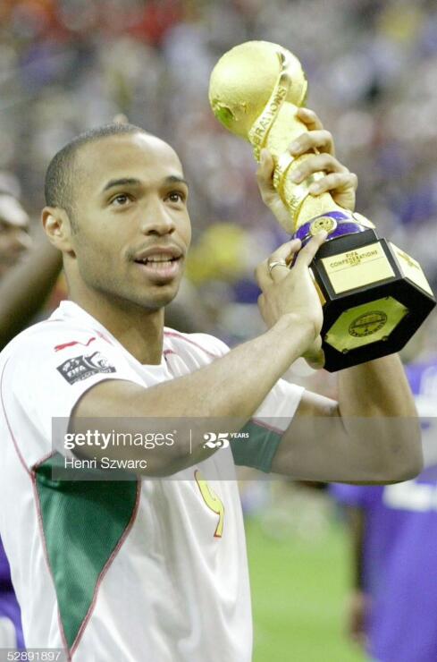 回到英超,卧薪尝胆的亨利变得更加成熟,03年5月,阿森纳被利兹联主场击败,卫冕冠军失败,但是02-03亨利表现爆棚,英超联赛完成24进球23助攻的双20奇迹,虽然被范尼抢走了英超金靴,但是个人获得英超最佳球员称号。在2003年的联合会杯中,亨利一扫世界杯的阴霾,带领法国获得了冠军,个人表现更是无可挑剔,他在五场比赛打入4球,成为赛事最佳射手,决战中金球绝杀喀麦隆。他全面的表现让他在当年世界足球先生的评选中获得了第二名。
