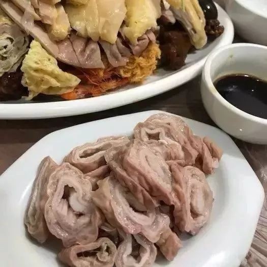 白切肥肠,南方有不少地方做。简单香料白水煮熟,白切蘸酱油。好食材用简单的做法,显示的是对选料和手艺的自信。