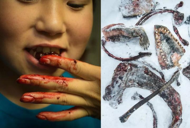 生吃海豹肝的因纽特人小孩与被放在室外冰冻的海豹肉
