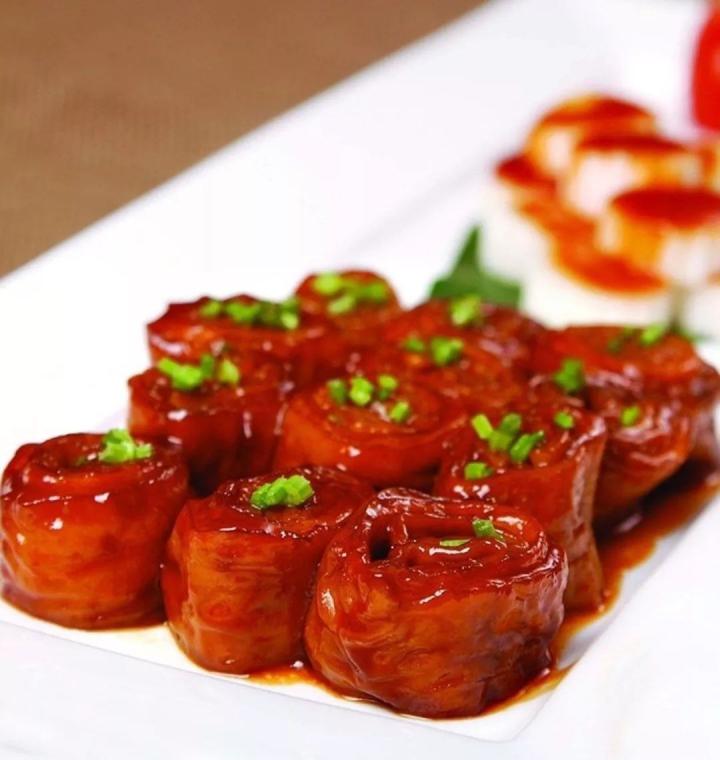九转大肠的外形特色是套肠,最外层是肠头,中间套较细的大肠定型烧制。最终成菜,要像一排排树桩那样竖立着。