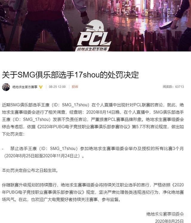 决定指出,近期SMG俱乐部选手王康(ID:SMG_17shou)在个人直播中出现针对PCL联赛的言论,就此,绝地求生赛事组委会进行了相关调查,经查明:2020年8月14日晚,在个人直播中,SMG俱乐部选手王康(ID:SMG_17shou)发表不负责任言论,严重损害PCL赛事品牌形象。