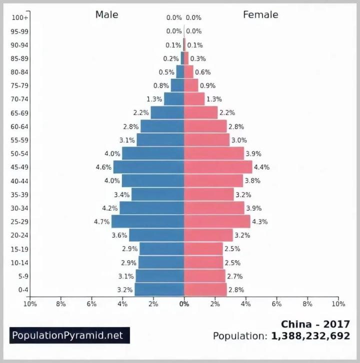 中国 2017 年不同年龄人口分布情况,其中约 60% 的人生活在三四五线城市及农村