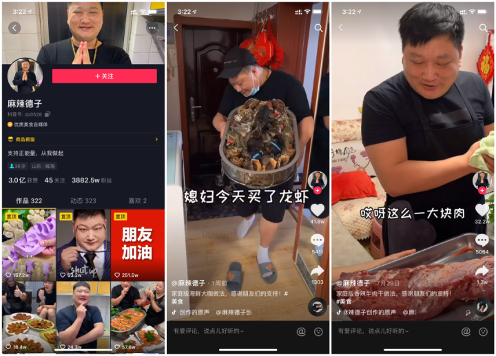 例如,抖音上有一位长相憨厚的麻辣德子,主要创作在家庭厨房里做家常菜的短视频,如今已有 3882 万粉丝,视频总点赞数 3 亿。