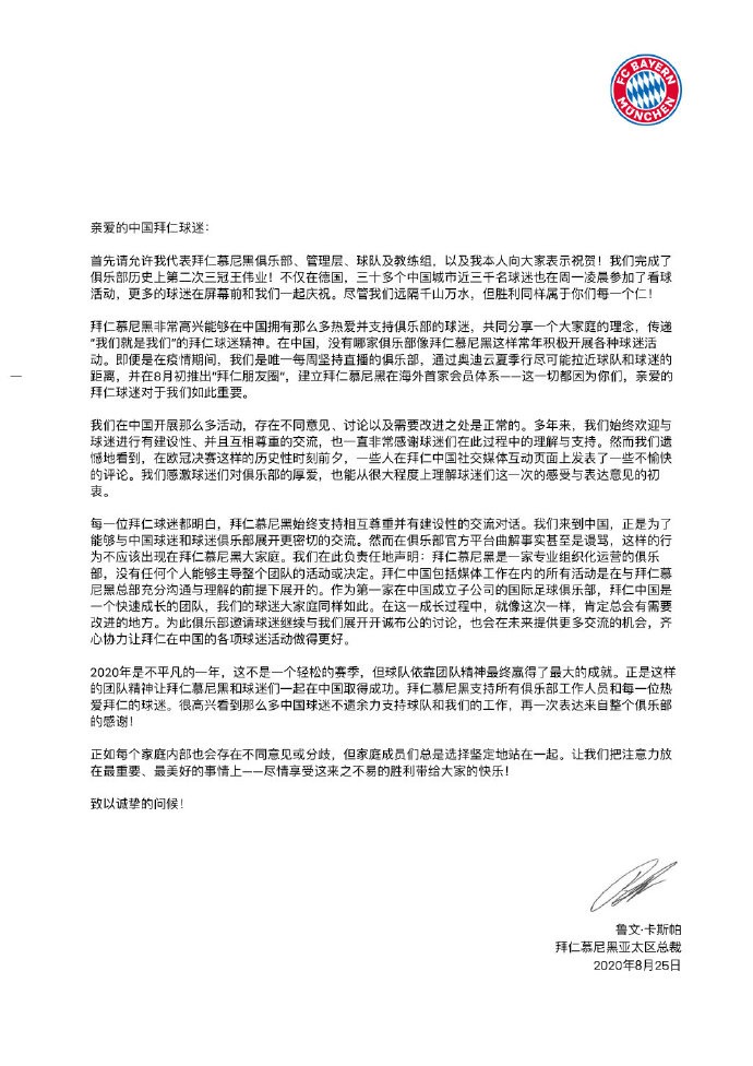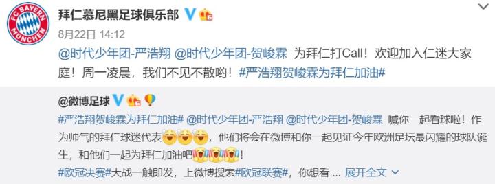 欧冠决赛前,拜仁慕尼黑官方微博曾邀请两名时代少年团组合成员严浩翔、贺峻霖为球队加油助威,此举引发了拜仁球迷的不满,认为官微不该做出“饭圈营销”的举动。昨晚,拜仁官微通过一封致球迷的信对此事进行了回应,但招致了更多争议。