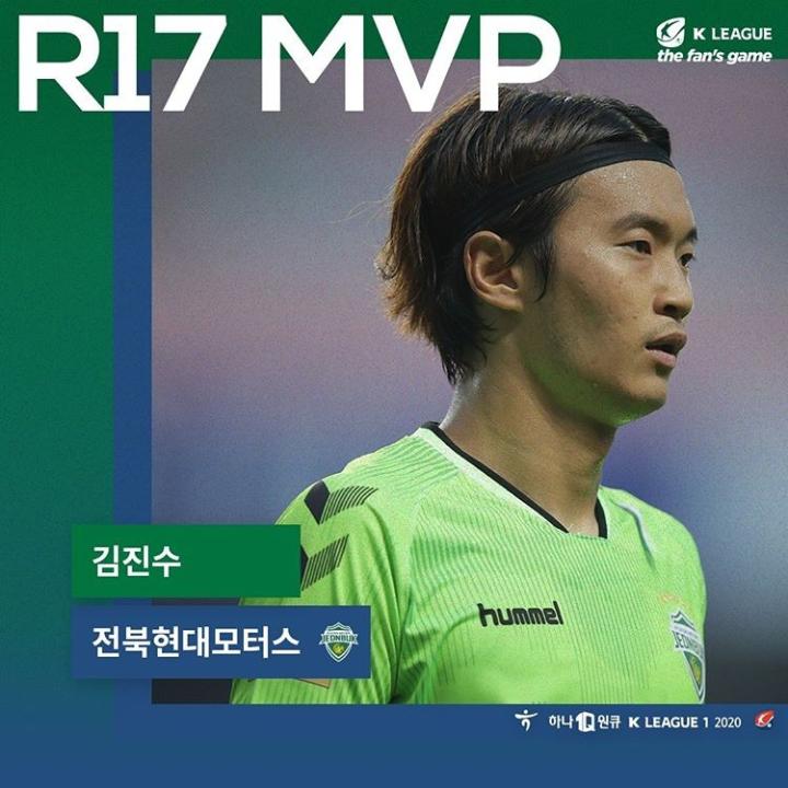 韩国K联赛官方宣布,全北现代后卫金珍洙当选了第17轮K1联赛的MVP。
