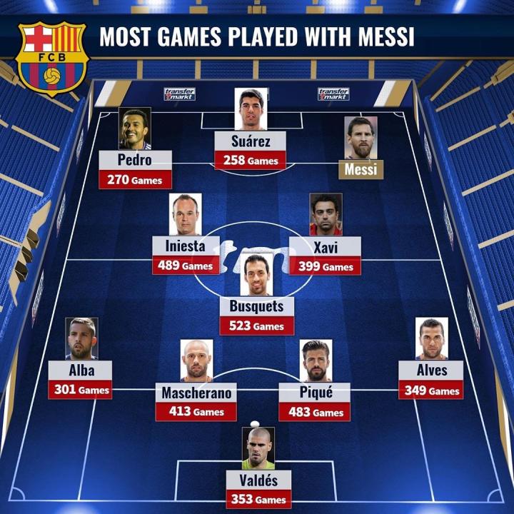 各家媒体报道了梅西即将离开巴萨的传闻,德国“转会市场”网站盘点了巴萨阵中与梅西同场作战次数最多的十人,组成了一个11人的阵容,其中布斯克茨是与梅西合作场次最多的球员,哈白布经典中场三人组的其他两位也在此阵容中。