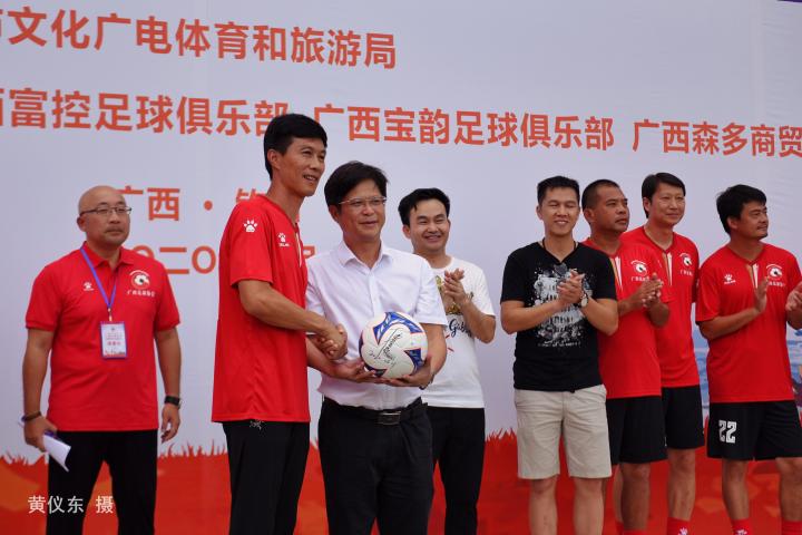 (钦州市文化广电体育旅游局党组书记、局长罗滨作为代表接过区楚良为市文化广电体育旅游局赠送的足球)