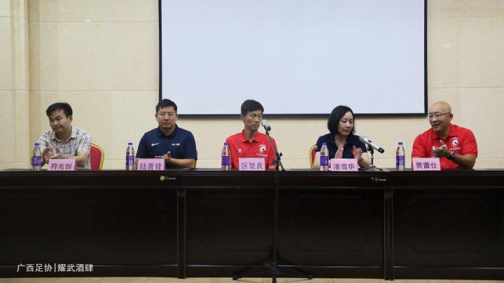 8月28日上午,中国足协高级讲师、原国足名脚区楚良、中国足协讲师陆晋锋于钦州市体育中心开展青少年足球专题讲座,这是广西青训中心钦州青少年足球节的最后一个活动。广西足协副主席贾蕾仕、钦州市文化广电体育和旅游局副局长潘雪华,钦州市足协主席符兆创,广西足协裁委会副主任蓝壮旭参加了此次讲座。