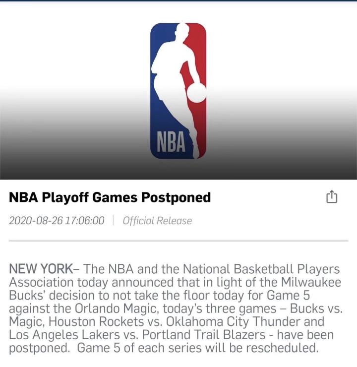 雄鹿队的罢赛,得到了湖人等其他球队的相应,NBA和球员工会也发表联合声明,宣布今天三场比赛全部推迟。不过,勒布朗·詹姆斯随后通过社交媒体表示,这次行动不是“推迟比赛”,而是“抵制比赛”。