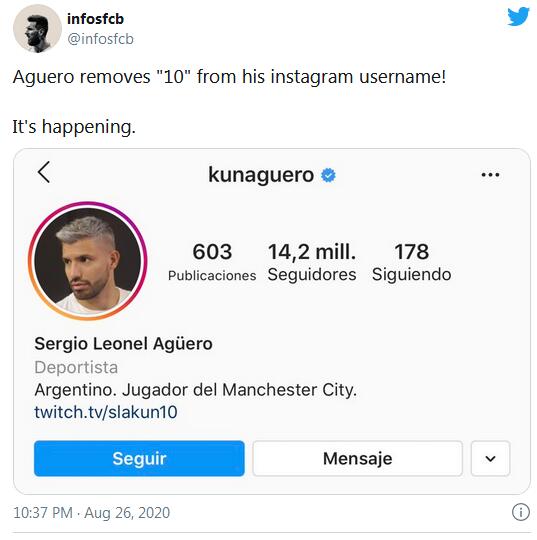细心的球迷发现,曼城头号射手、梅西的同胞兼挚友阿圭罗悄然更改了自己社交媒体的名字,从“kunaguero10”的网名更改成“kunaguero”。众所周知,10号是阿圭罗在曼城的球衣号码,如今阿坤将10这个数字去掉,显然是一种疯狂暗示,因为梅西同样身披10号球衣。这或许意味着,阿圭罗是在为挚友主动让出10号球衣。