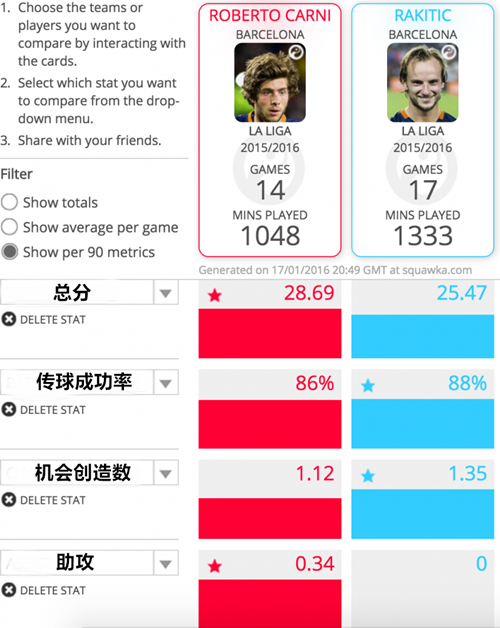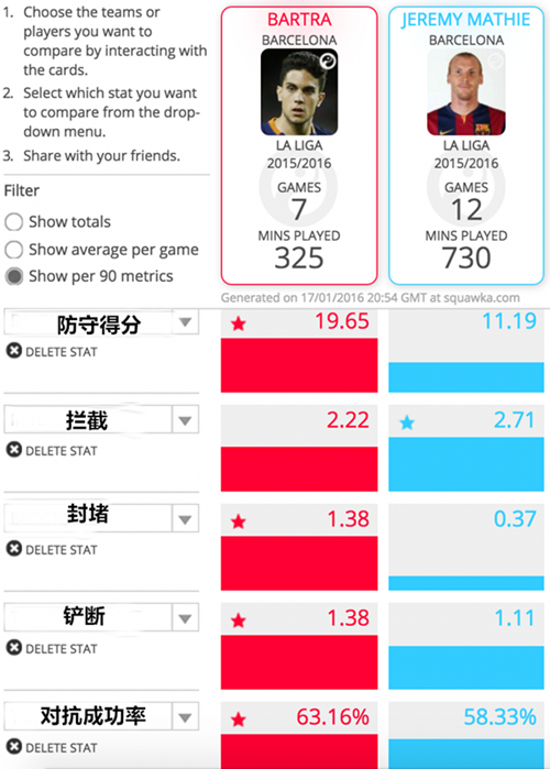 罗伯托和拉基蒂奇并不是唯一的案例,下面让我们转移视线,将注意力集中到巴尔特拉和他的直接竞争对手马蒂厄身上。通过对二者的直接对比,我们不难发现巴尔特拉的表现并不比法国人逊色。队草在90分钟内的数据甚至优于占据首发位置的马蒂厄。然而巴尔特拉本赛季获得的机会寥寥无几,他一共只得到了7次首发出场的机会,而上赛季他为巴萨首发出战的次数也只有14次。