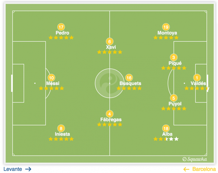 在巴萨于2012年11月25日4-0战胜莱万特的比赛中,巴西右边后卫阿尔维斯于比赛进行到第14分钟时受伤离场,顶替他的是巴萨青训出品蒙托亚。这次看似不经意的换人实则意义重大:场上的11名球员分别是巴尔德斯、蒙托亚、皮克、普约尔、阿尔巴、哈维、布斯克茨、法布雷加斯、佩德罗、梅西以及伊涅斯塔,这11名球员有一个共同点——他们全都出自巴萨的拉玛西亚青训营。