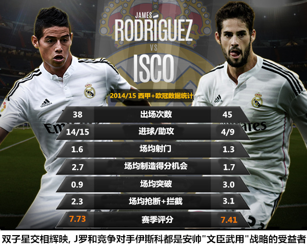 在因小腿肌肉伤势和跖骨骨折缺阵三个月的情况下,J罗依然录得45场17球15助攻的成绩单,其中联赛的数据达到了13球13助攻,成为西甲多年来首位刷出“两双”数据的中场。对于一个以支援BBC组合为首要任务的新人,J罗能够跻身欧冠冠军阵容,并打出自己的风格,已是殊为不易。