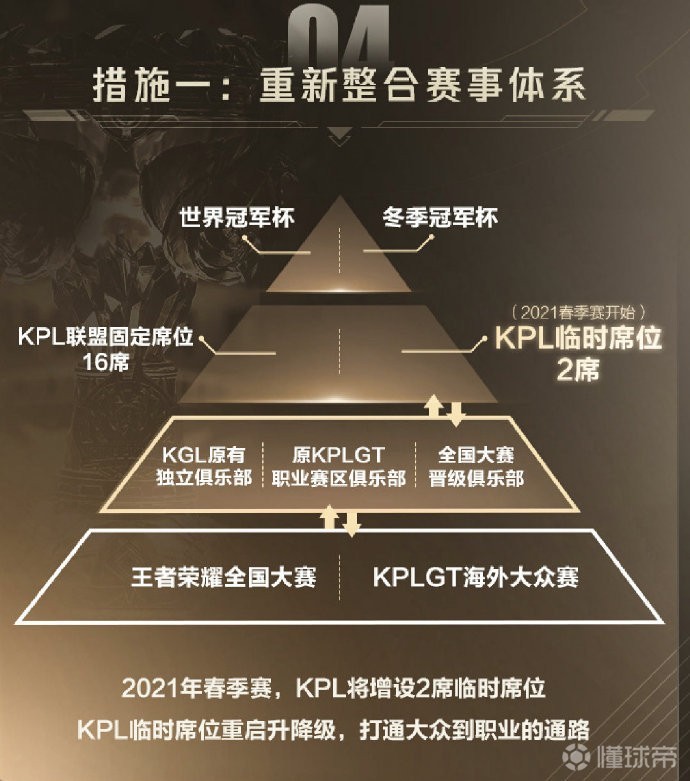 王者荣耀的赛事体系今后将分成冠军杯系列、KPL职业联赛系列、KGL职业发展联赛系列及大众赛事系列。KGL职业发展联赛将会整合不同渠道上升的队伍,成为连接职业联赛和大众赛事之间的次级联赛。给每一个有职业电竞梦想的人提供进入职业电竞领域的机会。