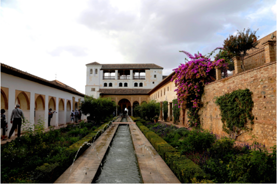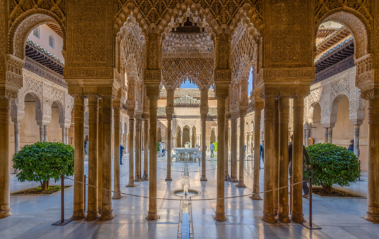 在格拉纳达的任何一个地方,抬头就能看到150米高的阿尔罕布拉宫显眼地耸立在城市上方。1238年,奈斯尔王朝(更常见的叫法是格拉纳达王国)的缔造者穆罕默德一世开始在内华达山脚下的小山上建造阿尔罕布拉宫,在13、14世纪里,穆斯林的、基督教的工匠们在这里敲敲打打、修修补补,在那个统治者没有远大理想也不可能有的时代,穆斯林们把大把大把的精力倾泻在这座辉煌宫殿的修筑上,整个宫殿群装饰极尽奢华,建筑结构精巧而富于变化,规模恢弘气势磅礴,宫殿里的花园、喷泉、随处可见的流水,这些数不尽的装饰更是宛如仙境,是伊斯兰世界建筑艺术的极尽精华之地,是伊斯兰世界留给世界的瑰宝。