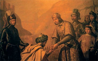 可以想象,在基督教光复运动的大潮下,小小的格拉纳达实在不堪一击,华盛顿欧文的笔下,在费尔南多三世收复安达卢西亚的过程中,他曾经也带兵围困过格拉纳达城,这座小小的城池根本不是卡斯蒂利亚大军的对手,而此时的摩尔人国王阿尔哈玛做了一个突然的决定,他独自一人前往基督教的营地,非常意外地出现在费尔南多三世的面前。表明身份后,他说,“我来到这里,将我自己归于您的保护之下,拿走我拥有的一切,接受我成为您的奴仆吧”,然后,他跪地亲吻费尔南多三世的手以示忠诚。
