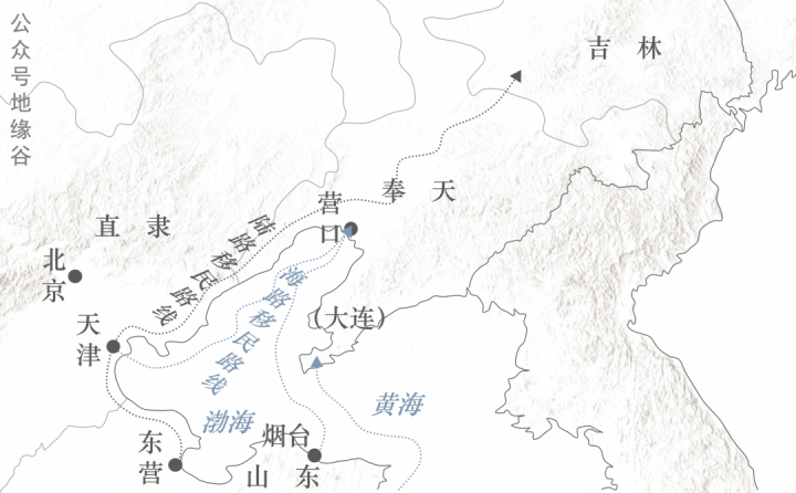 随后,山东河南等地便掀起了大移民的狂潮。迁徙的大潮分为两拨,一拨走陆路从河南、河北一路向北范围翻越山海关,沿辽西走廊奔向辽河平原、吉林、黑龙江,而另一拨人则走海陆,从胶东半岛的烟台青岛威海坐船,乃至腰里绑个瓢(葫芦),就沿海流冲向了辽东半岛,在大连等辽东半岛南部沿海登陆。