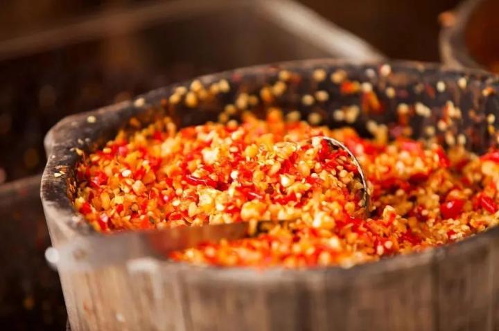 把辣椒剁碎放入瓦瓮中,再放入豆豉和大蒜,以一层辣椒一层盐的方式腌制、发酵,不用一个月时间就能变成“湘菜之魂”。