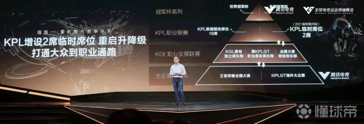 联赛里有16个固定席位,此外增设两个临时席位,成员来自发展联赛KGL。我们最新的大众赛事品牌叫王者荣耀全国大赛,优胜队伍能晋级KGL,KGL优胜队伍再晋级KPL,如果升级后不能夺冠需要跟KGL优胜队伍再去角逐下赛季名额。