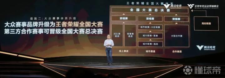为了自下而上地拓展电竞人口,王者荣耀在2020年的世界电竞领袖峰会上宣布,将大众赛事升级为王者荣耀全国大赛,通过线上赛、城市赛和第三方赛事,这套赛事体系有机会覆盖数千万人口。