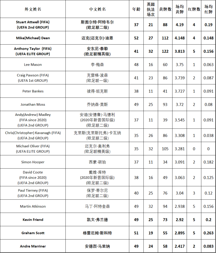 但毕竟每个人的执法风格不同,就算是英超也有以迪恩为代表的严哨,但一直被英国当地球迷称为“Card Shark”(就翻译成卡牌大师吧)的迪恩本赛季的场均黄牌数居然被阿特韦尔超越,仅排名第二。阿特韦尔在21场英超联赛中出示了88张黄牌,场均达到了4.19张。