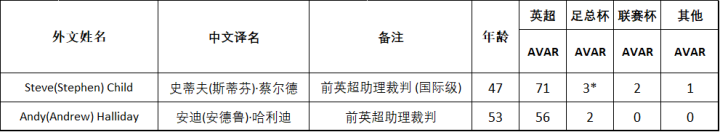 本赛季启用视频回放技术后,英超联赛的VAR均由裁判员担任,而AVAR则由助理裁判员担任。助理裁判员团队中担任AVAR次数最多的是本赛季结束后退役的安迪·加勒特,他担任了15次AVAR。此外,PGMOL还组建了一个专业的AVAR小组,专门负责担任英超、足总杯、联赛杯等赛事的AVAR,目前这个小组仅有两位成员,分别为去年退役的前英超助理裁判史蒂夫·蔡尔德以及安迪·哈利迪,两人在本赛季的英超联赛中各担任了71次和56次AVAR,蔡尔德还担任了足总杯决赛的AVAR。