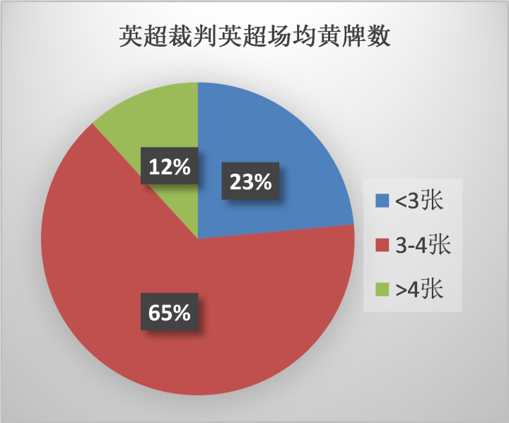 本赛季英超380场比赛中裁判员共出示了1281张黄牌以及45张红牌。场均黄牌3.37张,与上赛季相比稍有增加,而红牌总数比上赛季少了2张,场均红牌则是0.118张。总共17位裁判员中,有11位裁判的场均黄牌数都在2.0至3.0的区间内,占到了65%,而有4位裁判员的场均黄牌数在3张以下。从场均红黄牌数也可看出,英超裁判总体上还是保持着宽松的执法尺度。