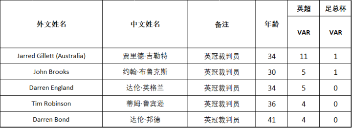 上述提到的特选VAR裁判组,是PGMOL为了减少英超裁判员的工作量,从英冠裁判组中选出了五位裁判员作为英超VAR的成员,其中包括澳大利亚籍裁判员贾里德·吉勒特(曾作为特邀外籍裁判执法过中超联赛),年轻裁判蒂姆·鲁宾逊、达伦·英格兰和约翰·布鲁克斯,以及英冠“老油条”达伦·邦德。吉勒特由于在澳超执法时积累了丰富的VAR经验,很快便得到了PGMOL的重用,本赛季共担任了11次英超VAR,比泰勒还要多。而其他四位则是只有4-5场的委派。