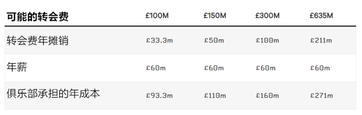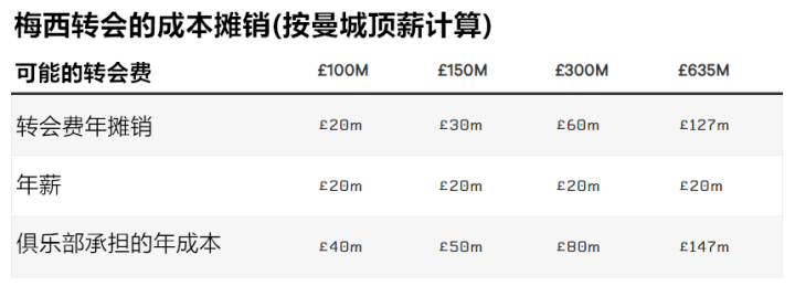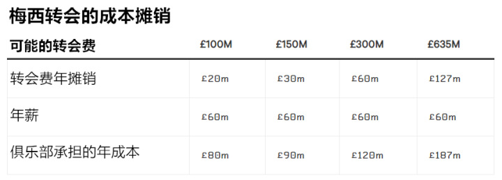 下面的表格展示了根据不同的转会费,曼城每年需要承担的成本情况,而在薪水方面则是基于梅西在巴萨效力的收入。在梅西确认留队前,甚至有报道称,梅西接受了一份为期5年的合同,其中最后两个赛季他将在纽约城效力。
