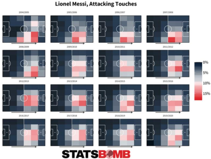 随着时间推移,梅西在球场上的位置变得越来越深了。根据数据公司Statsbomb的统计,在上赛季,梅西的许多触球都发生在中锋身后。不过,与此前几个赛季相比,他确实会更频繁地在球场右路活动。