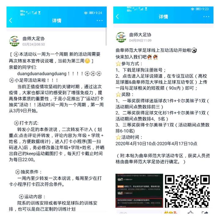 特别要提到的是,即使这半年因为疫情原因没有开学,曲师的足球活动也没有停摆,各个宣传平台上打卡抽奖、视频征集等活动丰富多样,同学们虽然分散各地,但是始终与曲师足球在一起。