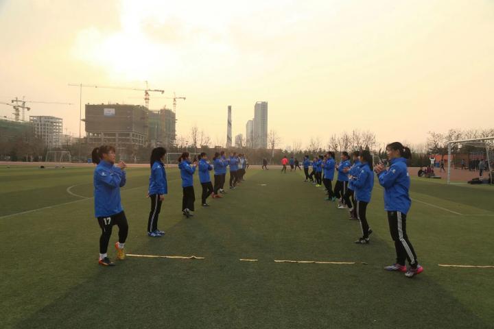 为了备战各项比赛,校内每个女足队伍都有自己固定的训练时间,很多时候刚过早上六点,球场上就已经有了姑娘们的身影。下午的训练场地更加火爆,因为曲师男女足队员数量加起来很多,仅是日照校区的十二个院系,男女足加起来就有二十个多个队伍。所以下午没有课的同学会早于训练时间去占场地,到了训练时间,训练场会被同学们占满,有时候甚至一场难求。