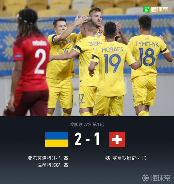 另外一场欧国联比赛中,凭借曼城球员津琴科的弧线球破门,乌克兰2-1战胜瑞士。