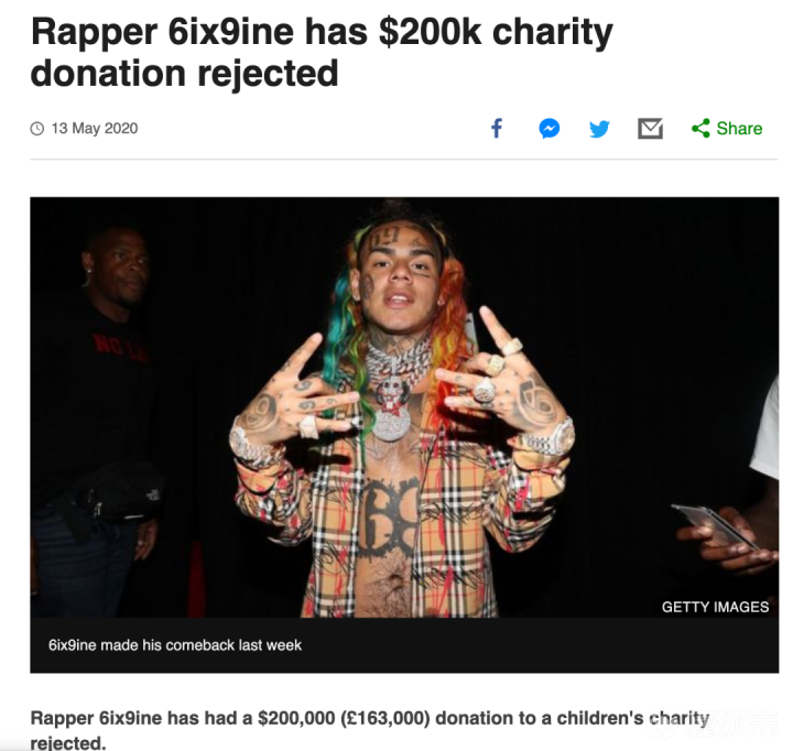 说唱歌手6ix9ine的20万捐款被拒绝/BBC新闻
