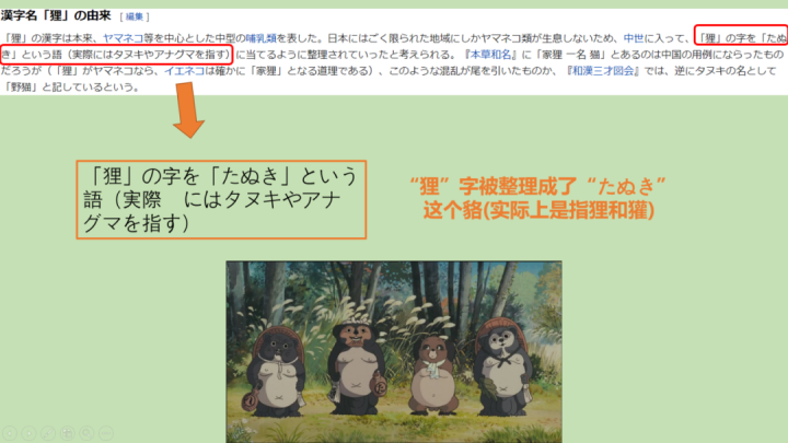 而实际上タヌキ「tanuki」 在日语中对应的汉字是单字「狸」,而非翻译中经常出现的「狸猫」。