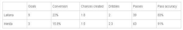 从进球数来看,拉拉纳出类拔萃,他在进球方面表现得非常出色,本赛季他已经收获了9个联赛进球。本赛季本土中场球员中也只有杰拉德的进球数比他要多。拉拉纳在创造次数上同样比得上伊涅斯塔(甚至超过),而他的场均过人数也只是稍逊于伊涅斯塔。