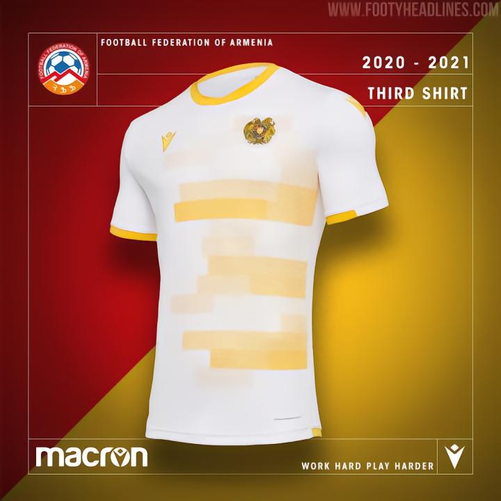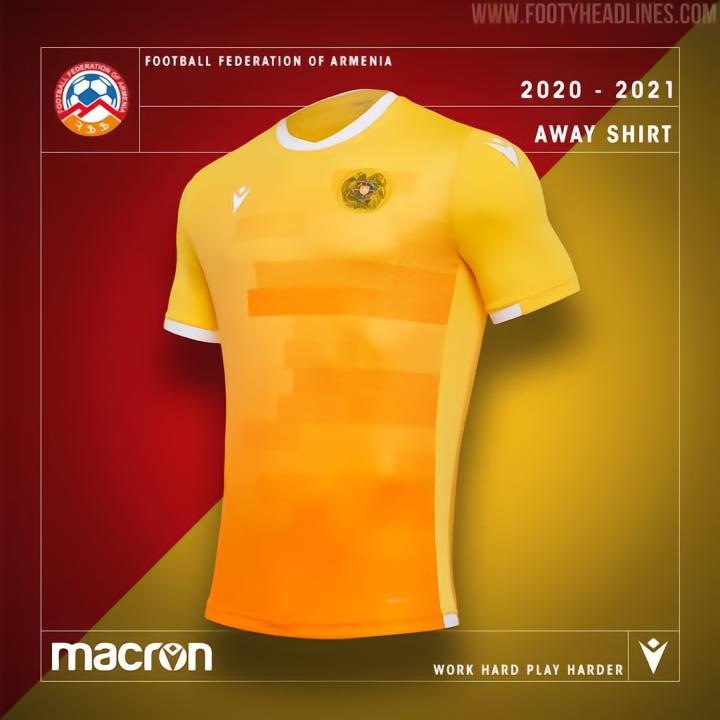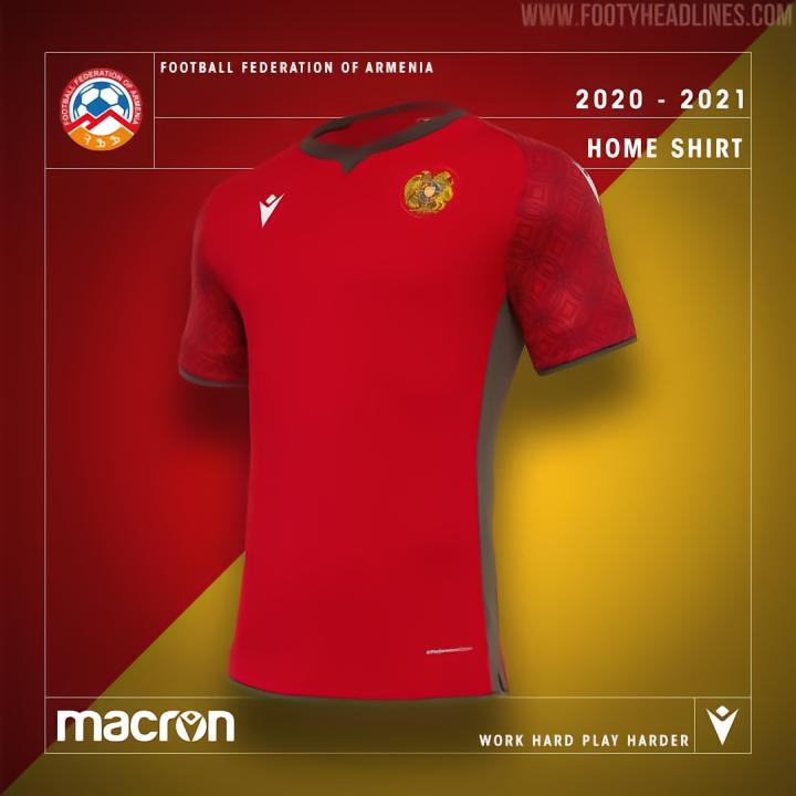 Macron为亚美尼亚打造的主场球衣为红色,衣领、侧面条纹以及袖口为灰色,袖子上有着独特的图案设计。客场球衣以黄色为主,正面有着不同橙色组成的图案,第三球衣则是采用了与客场球衣相同的模板设计,主色调则是换成了白色。