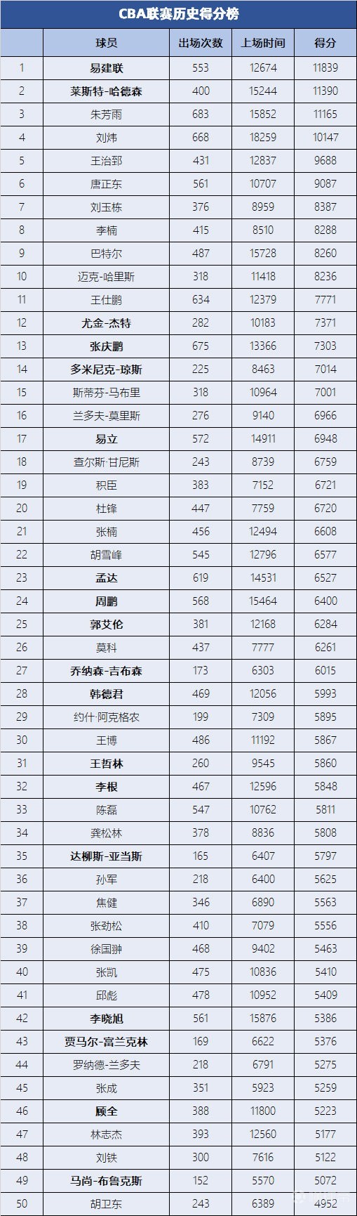 CBA联赛历史得分榜TOP50,易建联哈德森高居前二给他上上对抗 @懂球帝2020-09-07 20:11【CBA联赛历史得分榜TOP50,易建联哈德森高居前二】1.历史上一共有4位球员总得分超过1万分;2.易建联在2019-2020赛季成功登顶历史得分王; 3.得分榜前50名中,共有18位现役球员仍在刷新自己的纪录。展开更多