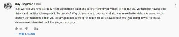 “我想知道你在制作视频之前是否牢记越南的传统。我们越南有着可以引以为豪的悠久历史和传统。为什么抄袭别人呢?你可以制作更好的视频来推广我们的国家和传统。我认为你是一个追求和平的素食主义者,所以请注意,你现在所做的事情是不道德的。越南需要才华横溢的厨师,而非抄袭者。”