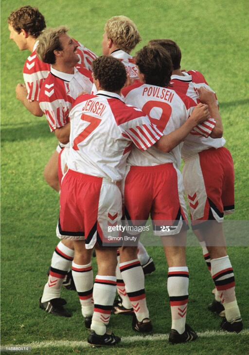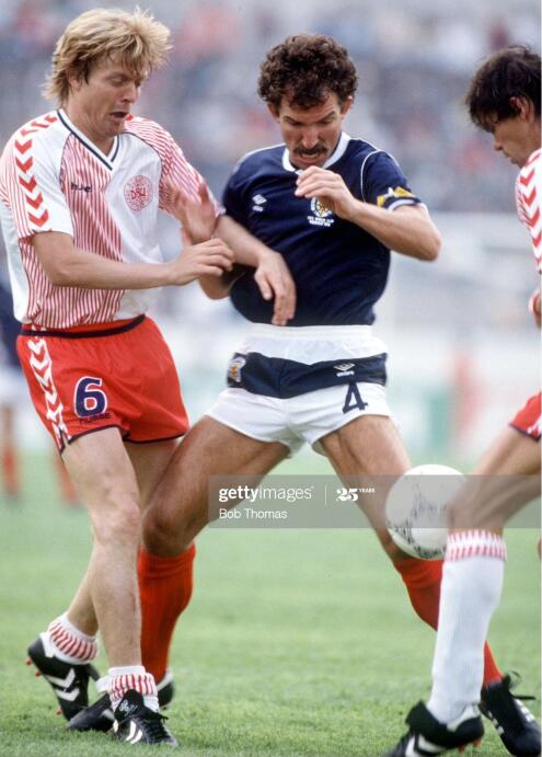 70-71赛季,hummel的白色和红色球鞋都出现在国英格兰联赛中,阿森纳队的查尔斯乔治就曾经穿过红色hummel球鞋。这也宣告了hummel以最另类的方式杀回了足球领域。1974年世界杯之后,hummel品牌进入北欧市场,没想到一年后,hummel被丹麦商人全资收购,于是这个德国品牌摇身一变成为了丹麦品牌,1979年,hummel成为了丹麦国家队的赞助商。当时的足球服还都比较简单,但是hummel除了大黄蜂logo,还有箭头雪铁龙logo,可以运用在球衣设计上,所以hummel的球衣特征明显,也很有视觉冲击力。