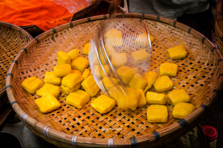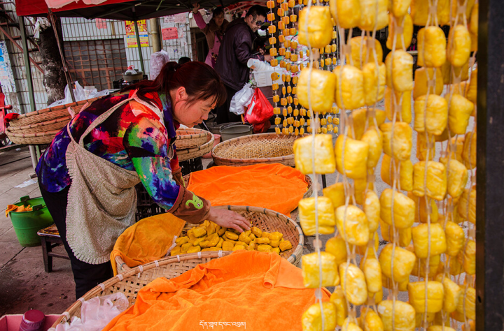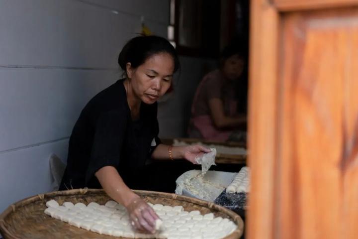 铺着石板的街道两旁,黄豆腐顺着房檐垂下,被来往顾客选中的豆腐,直接连绳子一起剪走。