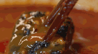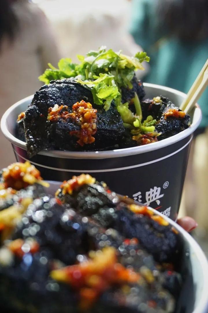 但其实,臭豆腐黑乎乎的表皮是因为浸泡在香菇与豆豉做的卤水里卤成的,煮好的臭豆腐,挑破一个口子,淋上酱汁、撒上辣椒,味道十分浓郁。