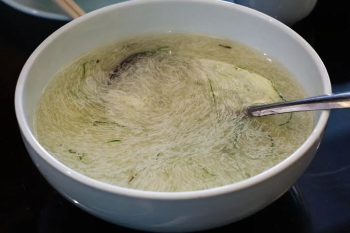 豆腐用刀切成菊花状焖汤,切丝的豆腐在碗中绽放出一朵花,花瓣瓣瓣分明,根部却不能断,开在汤中的花儿,娇艳欲滴。