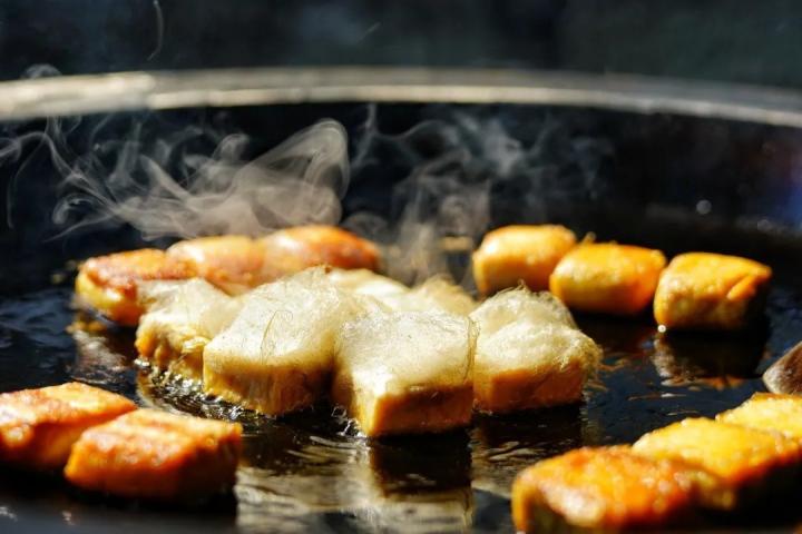 小火煮上十来分钟,让黄色的汁水慢慢渗入豆腐块的外皮,给豆腐染上了一层喜气的金黄,这是倘塘豆腐“黄”的秘密所在。