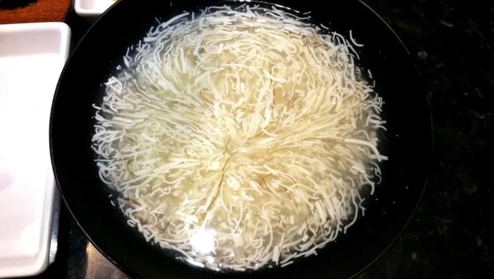 切好的豆腐要过水洗一遍,泡在水中的豆腐丝,细腻如同在水中散开的头发丝,飘飘洒洒,无拘无束。