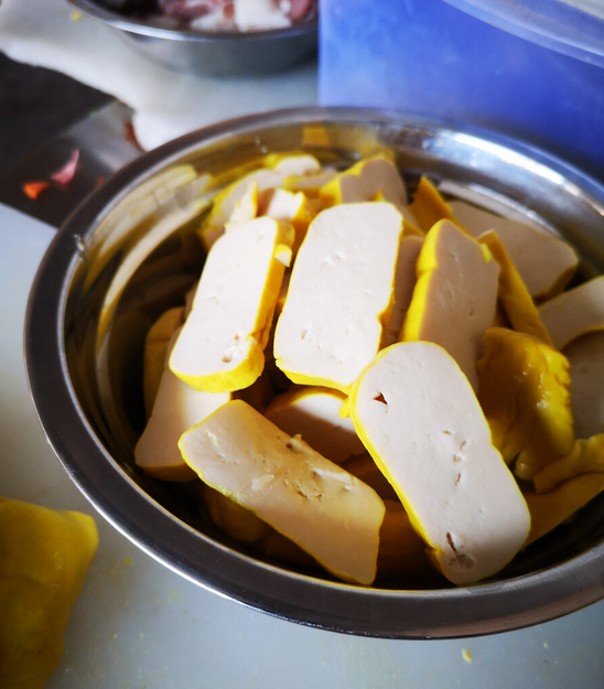 先把做好的豆腐用小块纱布包裹起来,浸放在一种叫姜黄汤的汤汁里。